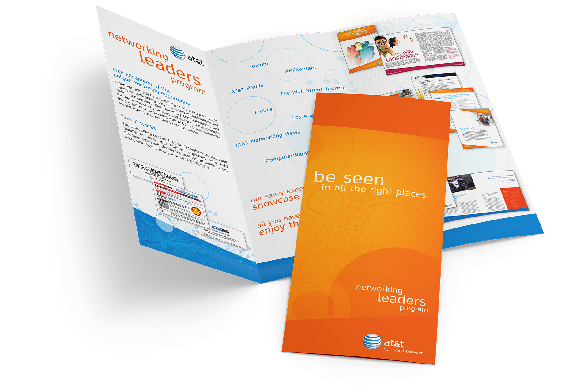 I designed a tri-fold brochure explaining the Networking Leaders Program and its benefits to potential participants. The piece needed to communicate both the strategic value (media placement, brand visibility) and the credibility AT&T brought as a facilitator—positioning enrollment as an exclusive opportunity rather than just another marketing program.