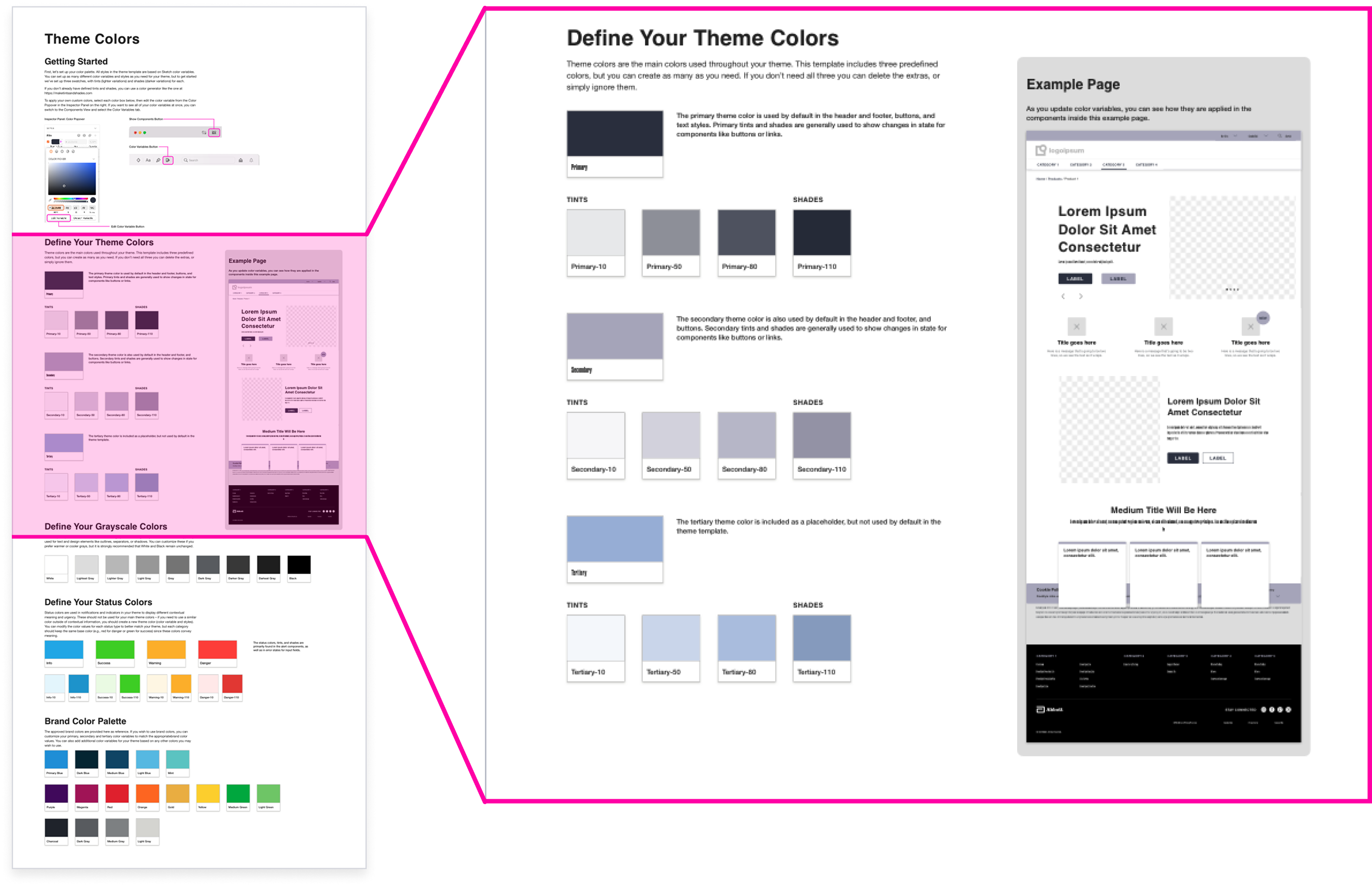 A dynamic start page in Sketch allowed designers to define color values and styles inline, instantly reflecting changes in a mock page template. While further customizations could be made at the component level, this approach enabled teams to set up branded libraries quickly and efficiently.